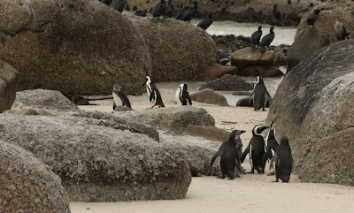 Kolónia Tučniaka okuliarnatého sa nachádza na pláži medzi obrovskými balvanmi blízko mesta Simon Town.