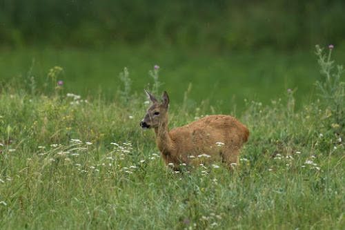 Pred rokom sme boli na návšteve v Dudíne a boli tridsiatky. Teplo ako v pekle. Zver vychádzala z húštiny až po zotmení. Teraz nám celý víkend pršalo a bola to veru iná káva. Vždy po prehánke sa zvieratá prišli osušiť na otvorené priestranstvo. Cez deň bolo dusno ale sotva 25 stupňov. Ráno aj večer bolo príjemne sviežo. Zver bola aktívna. Bez rozdielu druhu, veku a pohlavia. Nachodili sme sa síce tak isto ako minulý rok ale výsledok je neporovnateľný. Desiatky kusov čítajúce čriedy sa ukazovali jedna po druhej. Všade bolo mokro, šmýkalo sa a odevy nechceli schnúť. V lese bolo ešte horšie. Na topánkach sme mali na dôvažok pol kila lepkavého blata. Viditeľnosť bola kratšia a konáre pod nohami praskali rovnako hlučne ako počas sucha. Tiež pavučiny a všade prítomný hmyz si nenechali ujsť príležitosť znepríjemniť nám život. Nič nás však neodradilo. Pokračovali sme denne výlet za výletom. Od svitu až do mrku. Tentokrát to stálo za to.