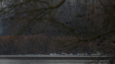 Že sa ten víkend v oblasti koná hromadná poľovačka sme vedeli ale nevedeli sme či obidva dni alebo len v sobotu či nedeľu. Sadol som si preto na miesto kde mi nehrozila guľa v gebuli. V jednom momente bolo jasné kde sa to celé odohraje. Po mojej pravej ruke sa postupne ozvalo tak dvanásť až päťnásť výstrelov. Z lesa vyletela tak stovka vrán a hneď po nich skočilo do vody sedem diviakov. Mohli to urobiť trochu bližšie. Fotky sú len dokumentačné. Sotva prebrodili na druhý breh, do vody skočilo s veľkým šplechotom niekoľko desiatok jeleňov sústredených v jednej čriede. Na moju škodu brodili na tom istom mieste. Po nich ešte v panike dobiehali oneskorenci. Asi ich tlačili strelci. Počas ich brodenia sa ešte ozývali sporadické výstrely. Úplne na koniec do vody vbehol mladý jelenček. V tom zhone sa oddelil od čriedy. Prebrodil ako mnohokrát predtým a neskôr sa určite s mamou zase stretne.