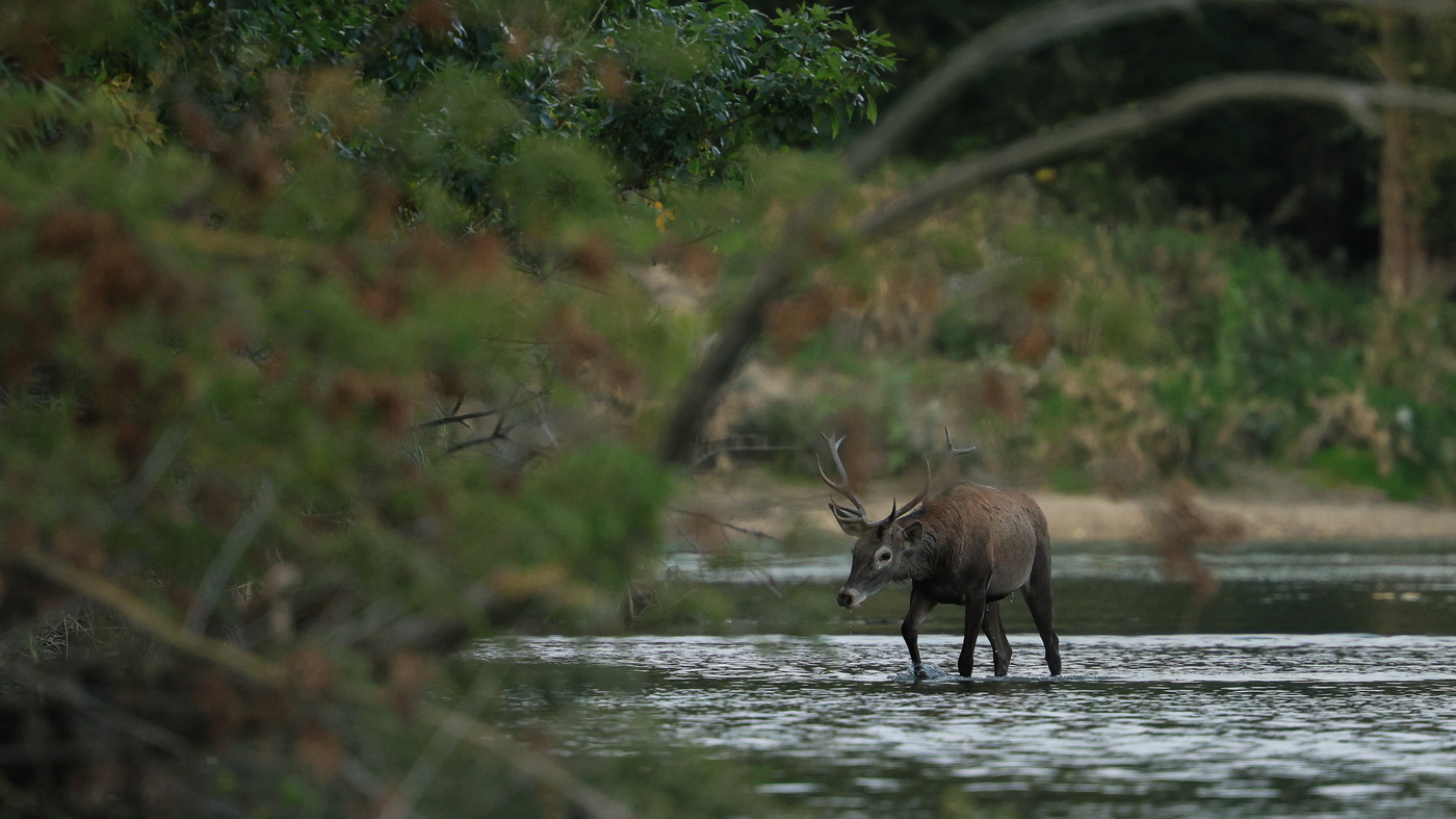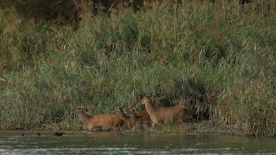 Zákon schválnosti funguje. Beste platze tento rok na brodenie jelene nepoužívali a tak sme si zohnali loď aby sme sa mohli presúvať na ostrovy. O tom som už písal. Predtým som vždy sedel pri veľkom ružovom kameni, ktorý sa povaľoval na brehu. Teraz ho je vidieť na fotke osamelého obzerajúceho jeleňa vo vode a na viacerých na konci sady. To miesto som opustil lebo tam zver nebrodila. Zopár dní po zmene miesta samozrejme črieda prišla a rozhodla sa prebrodiť tam, kde by ju bolo najlepšie vidieť z pôvodneho miesta. Z nového miesta oproti sú zase trochu priďaleko. Neobvyklo skočil do vody najprv dominantný jeleň. Potom črieda laní a nakoniec v tesnom závese aj bočný jeleň.